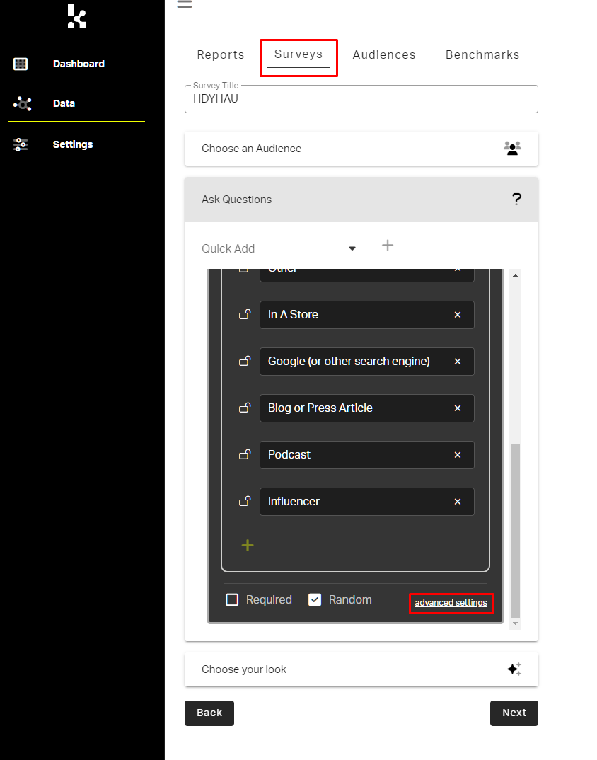- Scroll and select Advanced Settings for the question(s) that you would like to start tagging